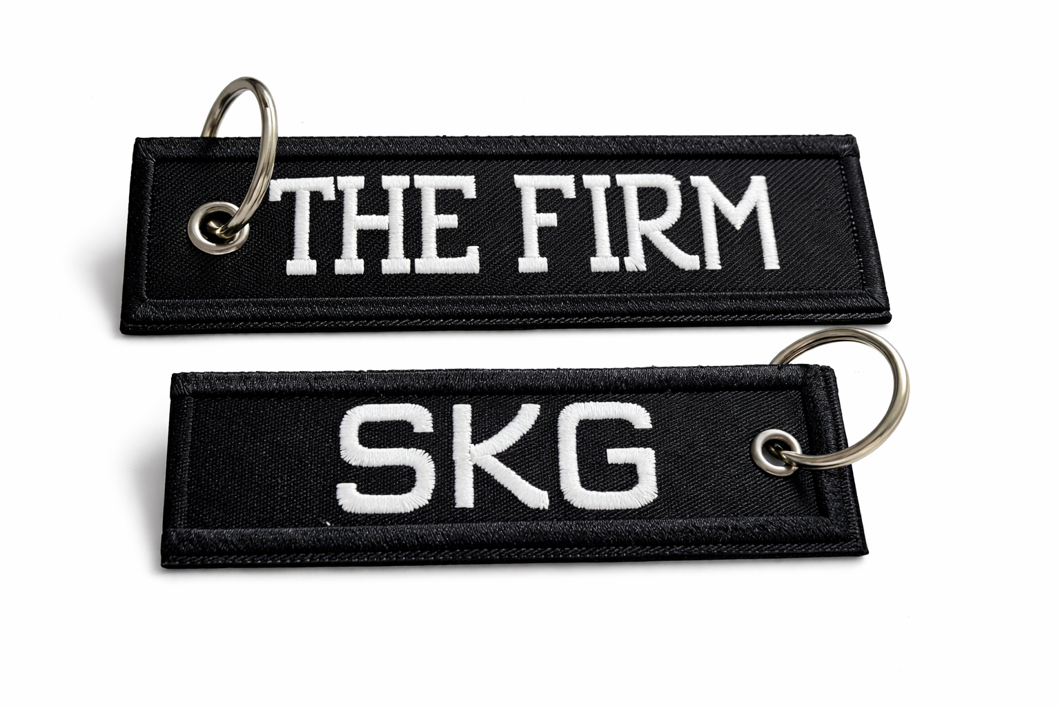 Υφασμάτινο μπρελόκ υψηλής ποιότητας με κεντημένα γράμματα και στις δύο πλευρές. Από τη μία πλευρά διαθέτει το σχέδιο THE FIRM, ενώ από την άλλη το “SKG”, προσφέροντας μοναδικό και δυναμικό στυλ.